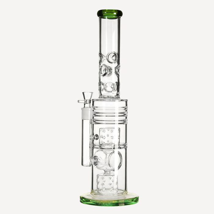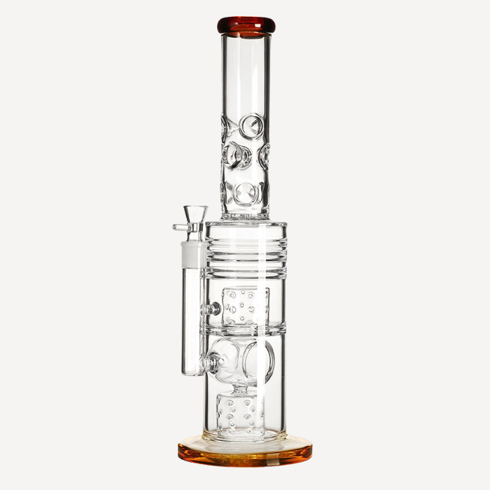 Make a statement with this 17-inch glass bong by Headsworld. Featuring a striking colour rim design and dual barrel percolators, it delivers exceptional filtration for a smooth and enjoyable experience. Crafted from durable glass, this piece combines bold, eye-catching style with reliable functionality, making it a standout addition to any glass collection.