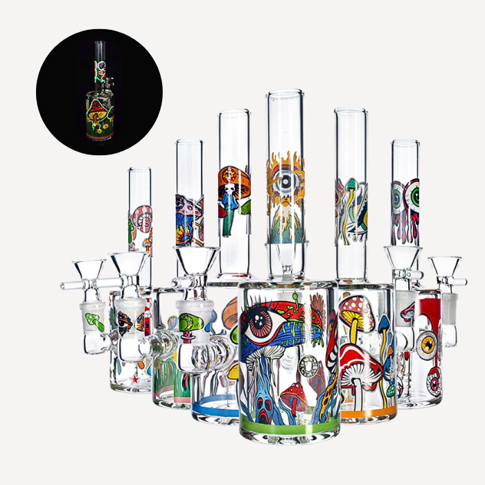 The Colourful Drippy Mushroom Glow In The Dark Glass Bong by Headsworld stands at 7 inches and features a vibrant, eye-catching design with drippy mushroom-inspired detailing that glows in the dark for an added visual effect. Crafted from durable glass, it offers a sturdy feel and smooth functionality, while its bright, colourful artwork incorporates elements like eyes, plants, skulls, monsters, flowers, and swirling patterns, giving it a bold and imaginative aesthetic that makes it a standout piece for any setup.