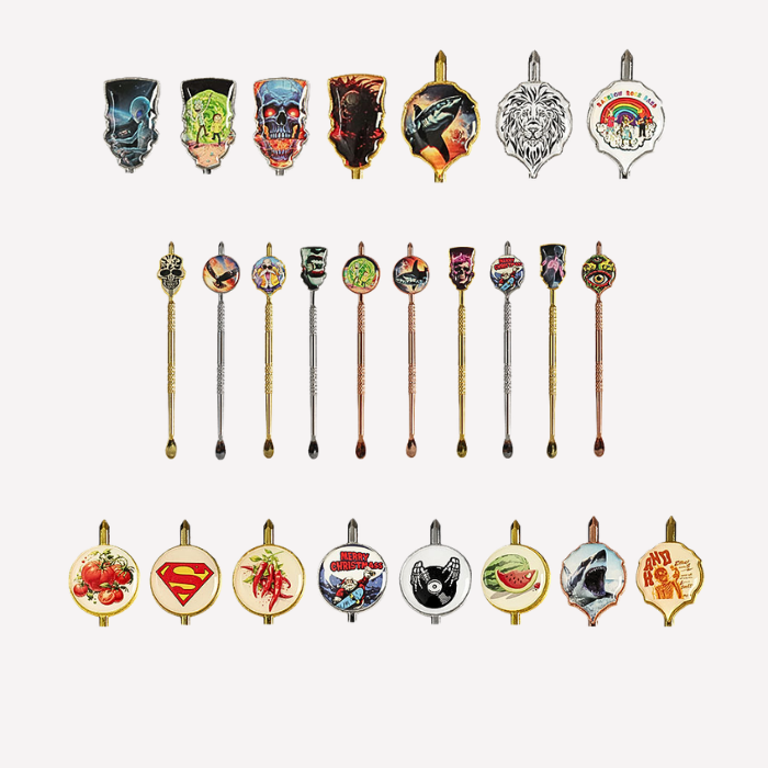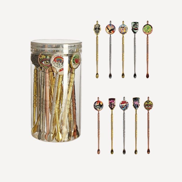 The Retro Design Silicone and Metal Dabbing Tool by Headsworld combines durability and style in a compact 4.5-inch design, featuring a sturdy metal tip for precise handling and a flexible silicone body for a comfortable, heat-resistant grip. Designs are random and may vary, showcasing cool, artsy styles such as vibrant flowers, rainbow patterns, ocean animals, skulls, eyes, and aliens, adding a bold and creative touch while delivering reliable performance for handling concentrates with ease and control.